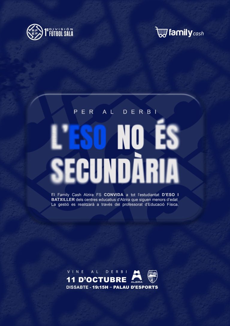 El Family Cash Alzira FS ha puesto en marcha la campaña “L’ESO no és secundària”, una iniciativa dirigida a los estudiantes de ESO y Bachillerato, que sean menores de edad, de los centros educativos de Alzira con el objetivo de promover un ocio saludable y deportivo para este fin de semana.